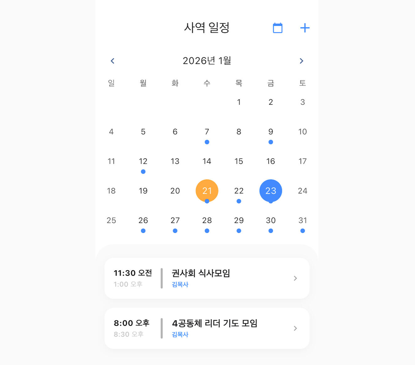 일정 조율은 스마트하게, 동역의 깊이는 더 깊게. 번거로운 확인 절차 없이도 사역자 간의 일정을 실시간으로 공유하고 소통하세요.