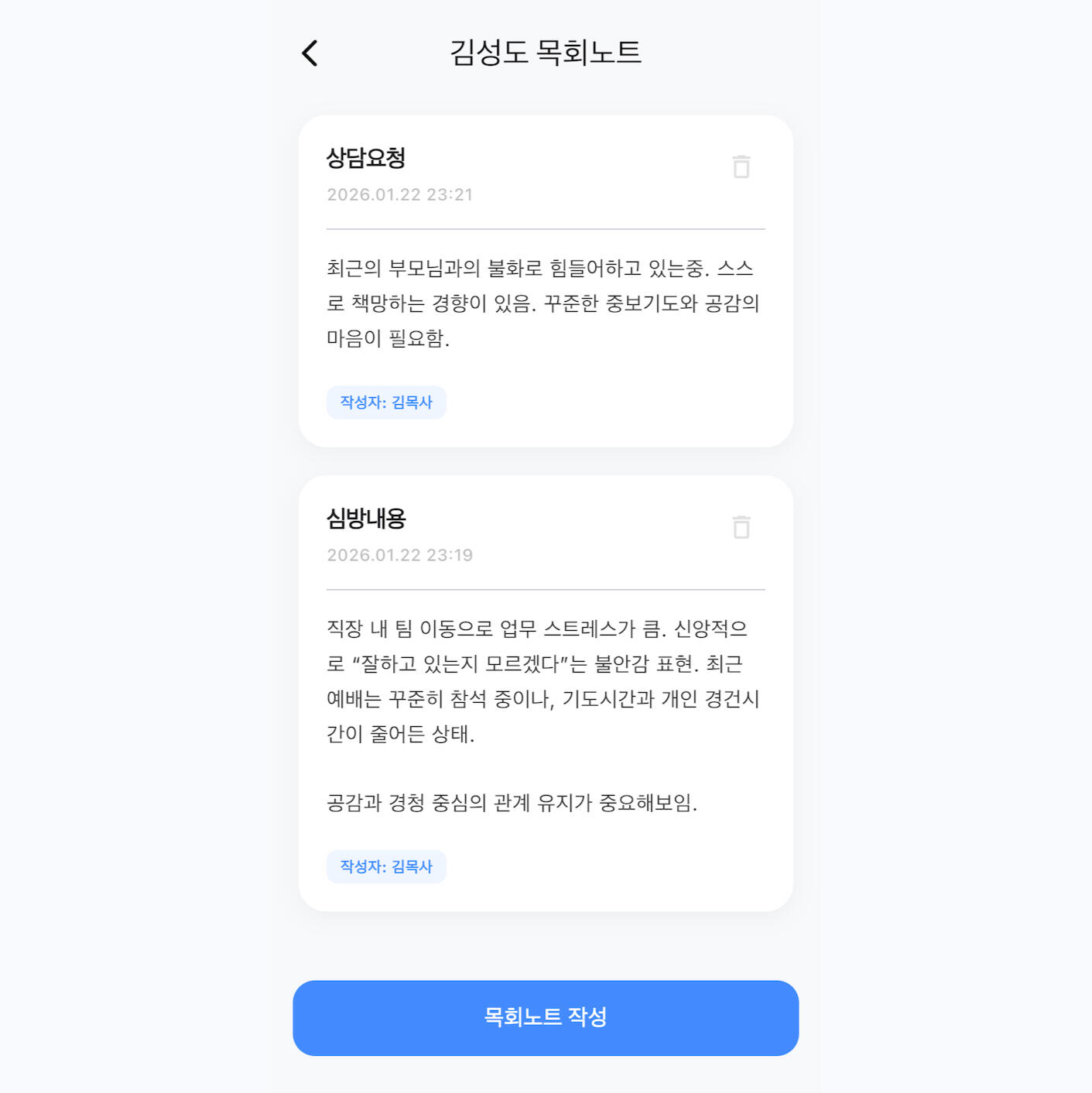 성도님의 기본 정보뿐 아니라 함께 나누었던 기도제목과 교재의 내용까지 함께 기록하세요. 한 번의 만남이 흘러가지 않도록, 코이노니아가 목양의 깊이를 더해드립니다.